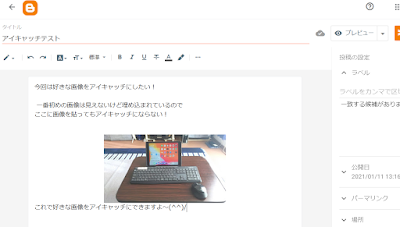 あとは普通に記事を書いていき画像を挿入してもこの画像は一番初めの画像にはならないのでアイキャッチにならず記事中の画像となります。